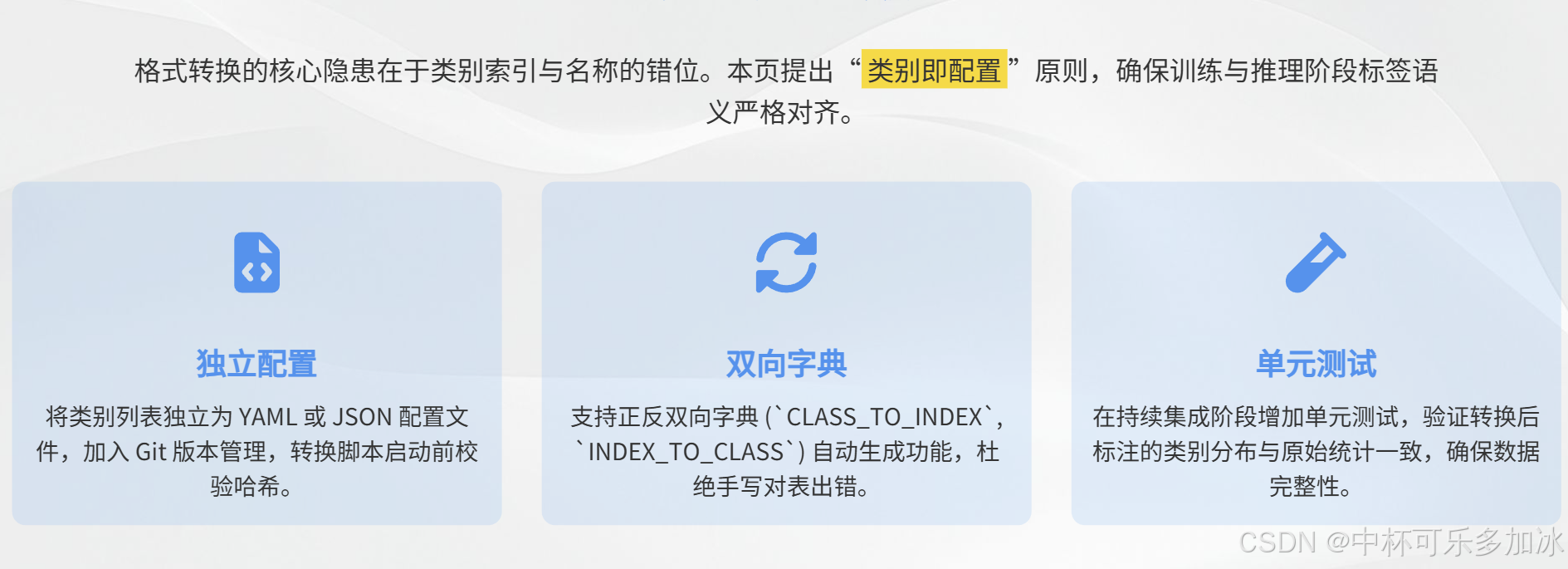 YOLO 和 COCO 格式都依赖于整数 ID 来表示类别,而 PASCAL VOC 使用字符串名称 。因此,一个鲁棒的类别映射机制是所有转换的基础。