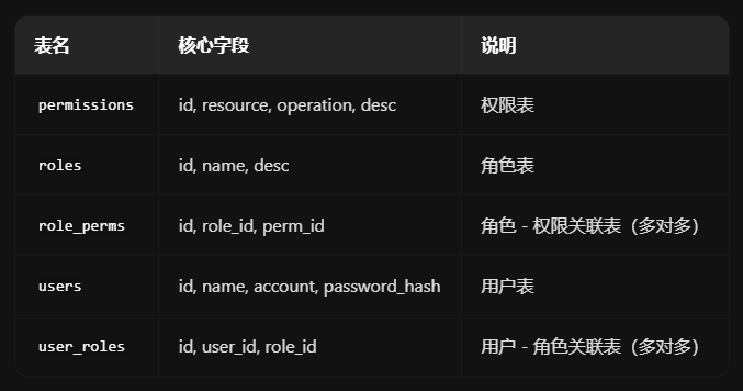 将 RBAC 数据(用户、角色、权限及关联关系)存储到数据库,推荐表结构设计: