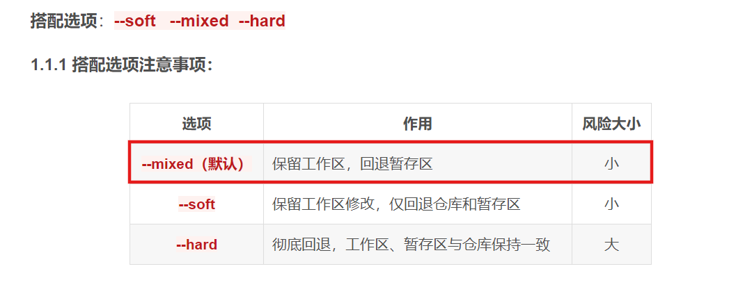 | --soft | 保留工作区修改,仅回退仓库和暂存区 | 小 |