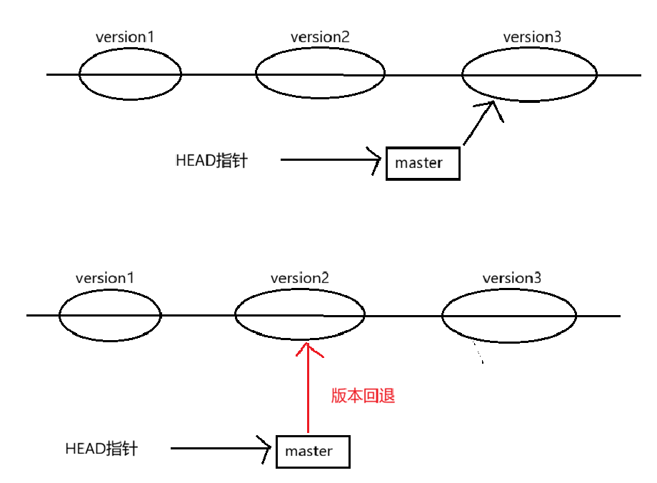Git 版本的回退速度特别快,因为 Git 在内部有个指向当前分支(此处是master)的HEAD指针,refs/heads/master 文件里保存当前master 分支的最新的 commit id,当我们在回退版本的时候。Git 仅仅是给refs/heads/master 中存储一个特定的version ,可以简单理解为如下示意图: