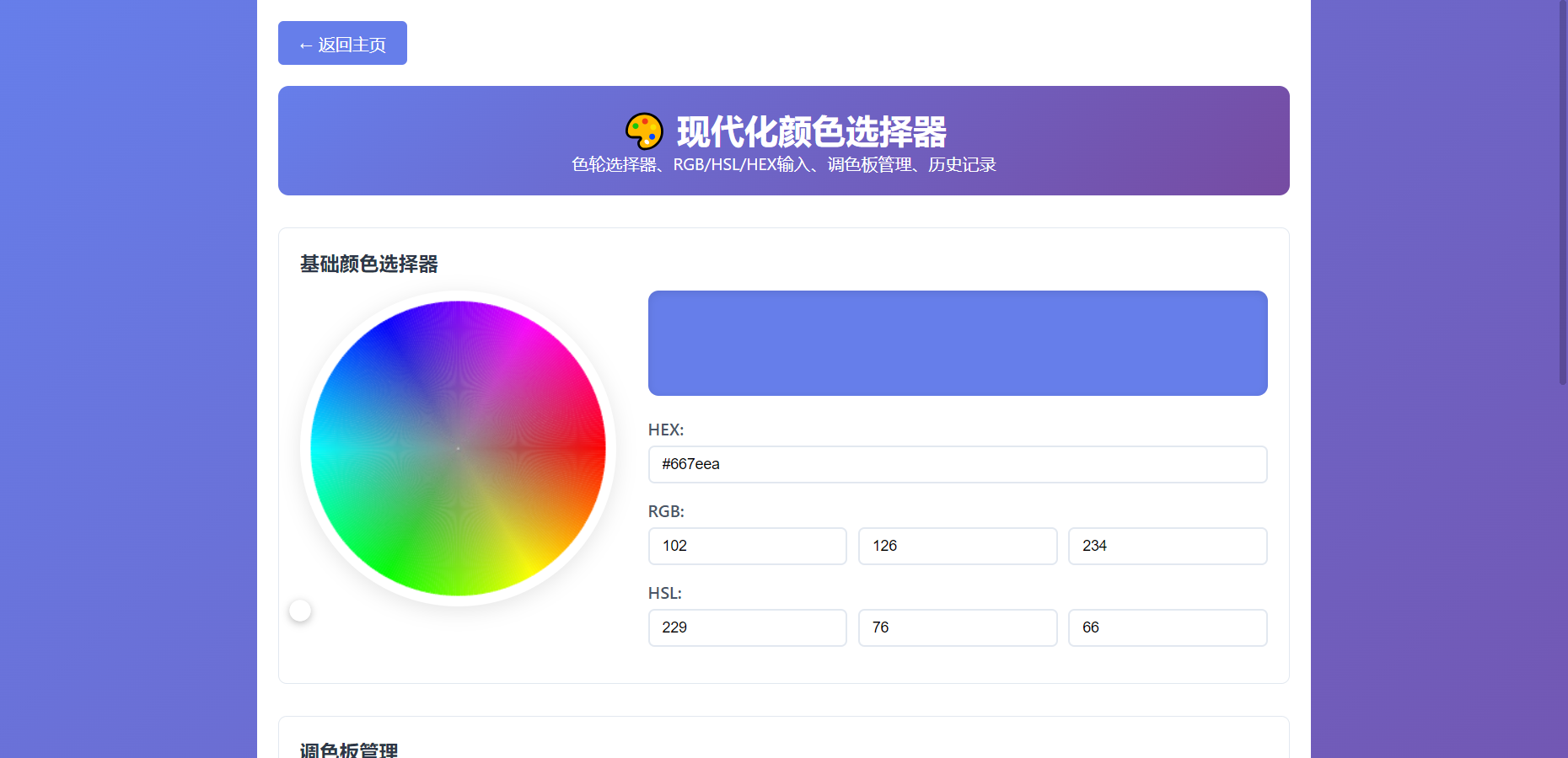 - 多模式选择器:集成色轮选择器、滑块选择器、拾色器三种可视化选择方式