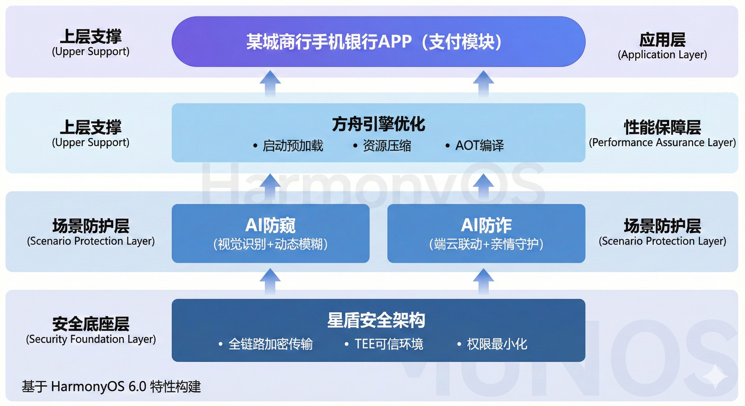 技术方案确定为"安全底座(星盾)+场景防护(AI防窥/防诈)+性能保障(方舟引擎)"的三层架构,重点突破支付页面防窥、交易数据加密、诈骗场景识别三大模块。