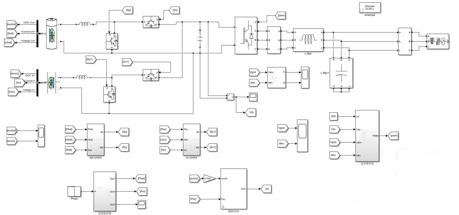 蓄电池与超级电容混合储能并网matlab/simulink仿真模型。 (1)混合储能采用低通滤波器进行功率分配,可有效抑制功率波动,并对超级电容的soc进行能量管理,soc较高时多放电,较低时少放电,soc较低时状态与其相反。 (2)蓄电池和超级电容分别采用单环恒流控制,研究了基于超级电容的SOC分区限值管理策略,分为放电下限区,放电警戒区,正常工作区,充电警戒区,充电上限区。 (3)采用三相逆变并网,将直流侧800v电压逆变成交流311v并网,逆变采用电压电流双闭环pi控制,pwm调制。 附有参考资料。