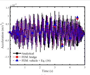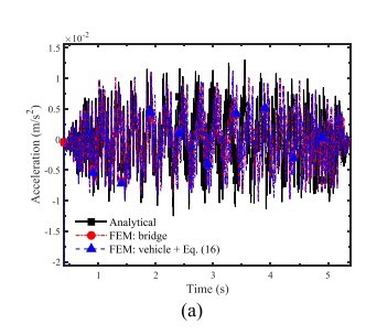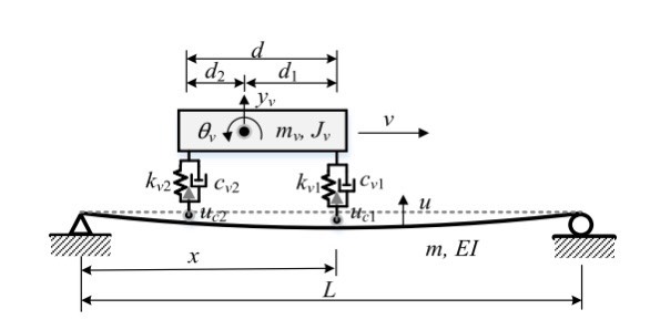 首先,我们得明确一下问题的背景。双轴两自由度车辆模型通常包括车体的垂直运动和俯仰运动,而桥梁则可以用简支梁模型来表示。车辆和桥梁之间的相互作用通过接触点的力来体现。我们的目标是模拟车辆通过桥梁时的振动响应,特别是车体的加速度和接触点的响应。