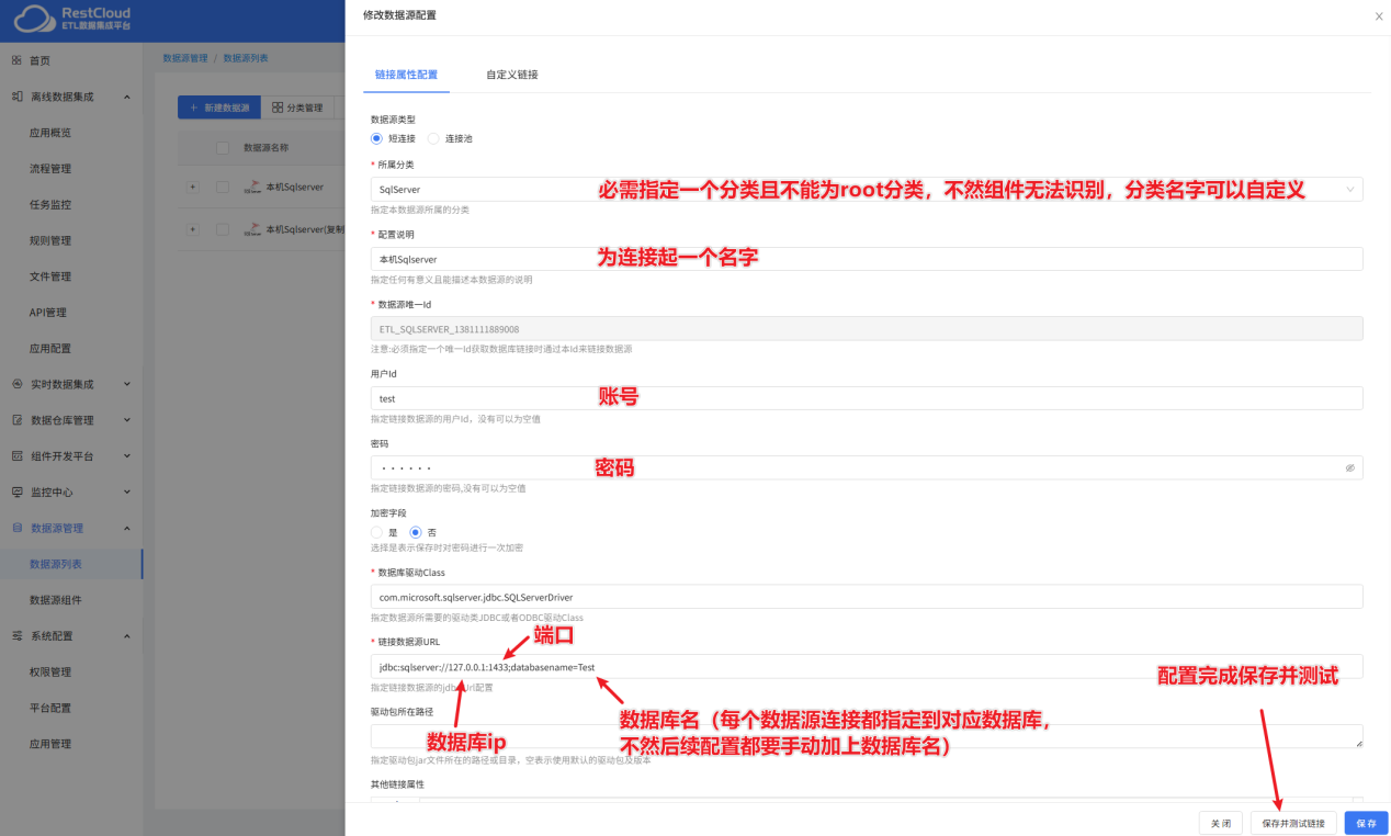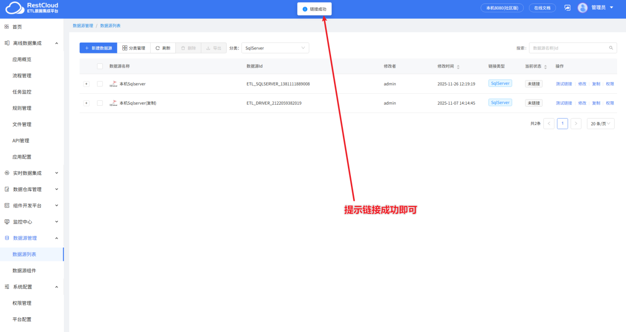 配置完信息后点击保存并测试连接按钮,上方弹出测试成功证明数据库连通。如果连接失败可以到监控中心查看控制台日志。