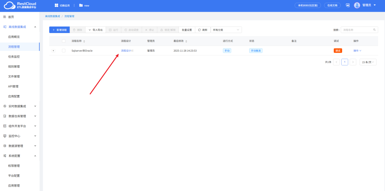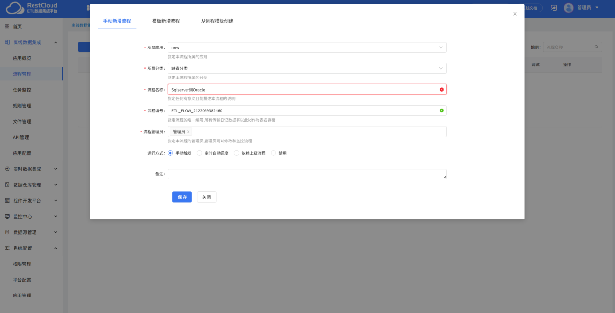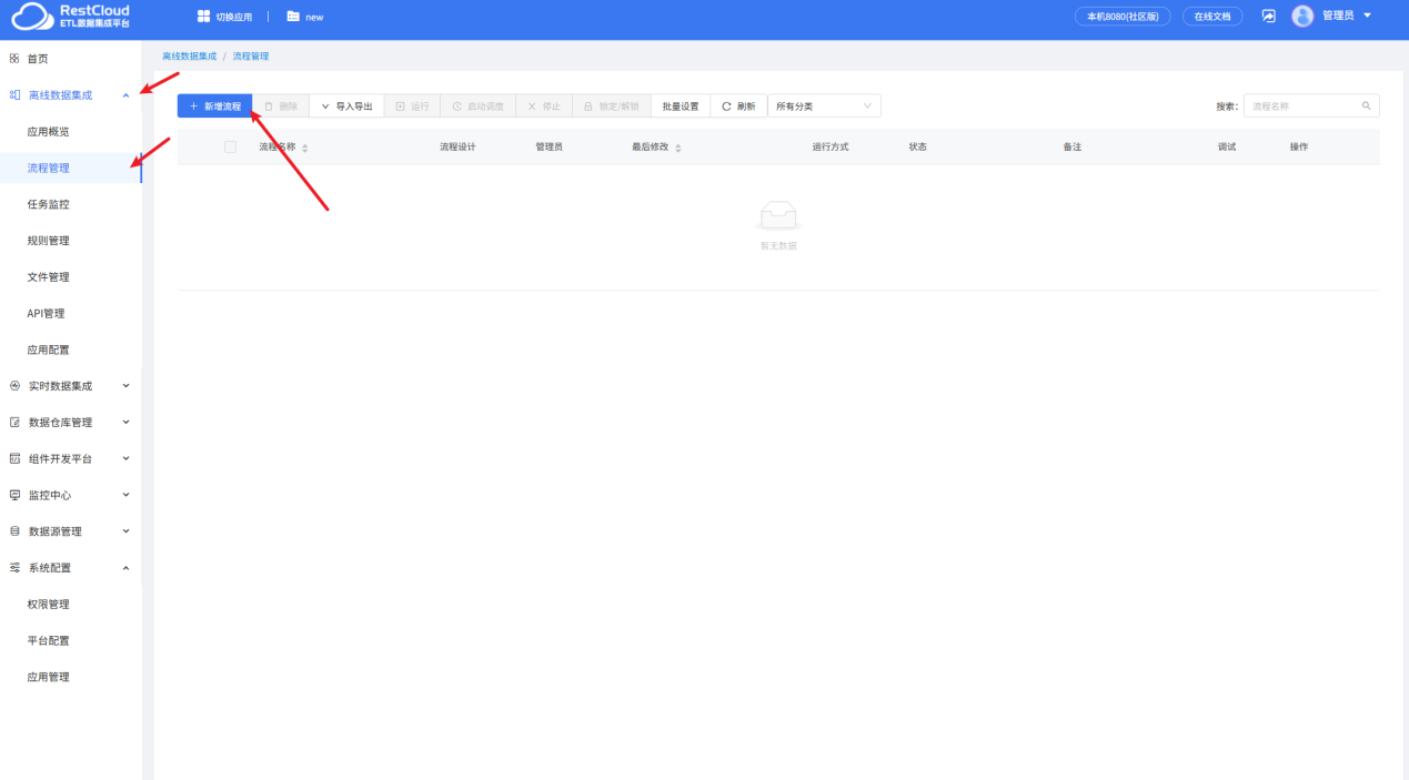 在左侧离线数据集成模块找到流程管理,点击新建流程创建一个新的流程。