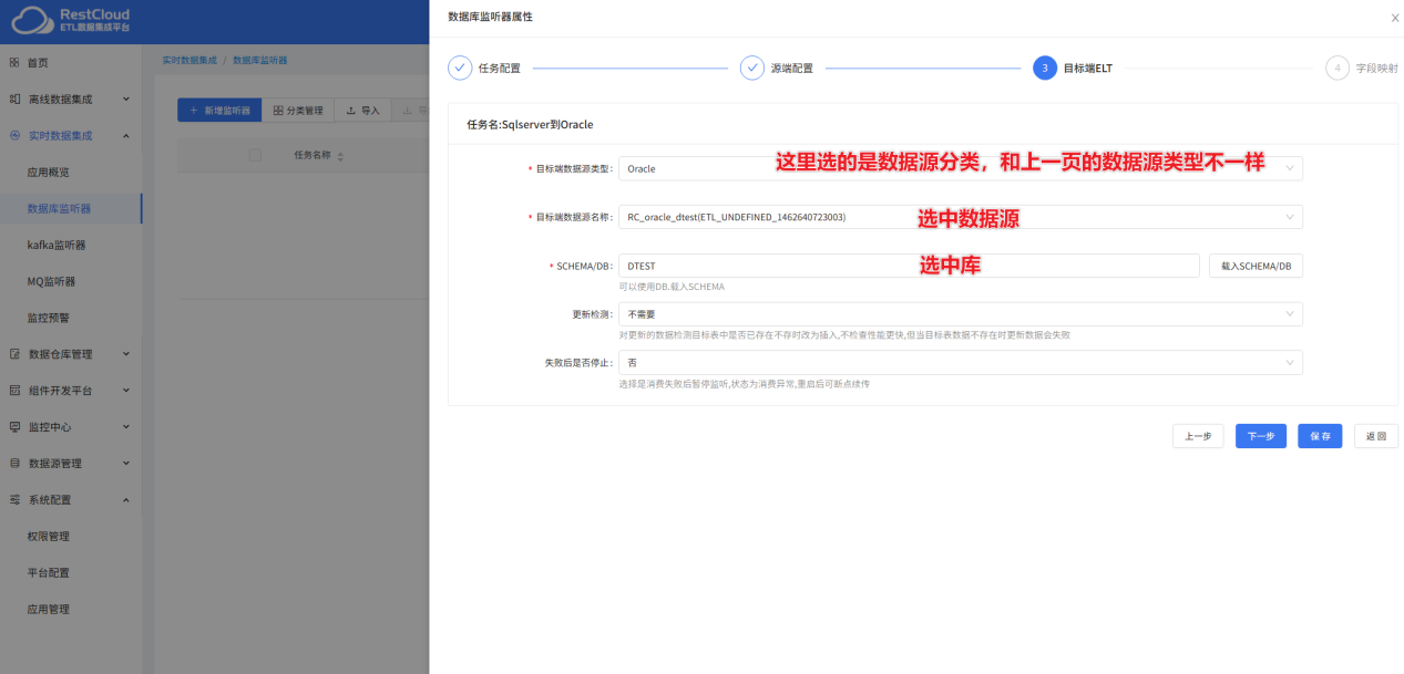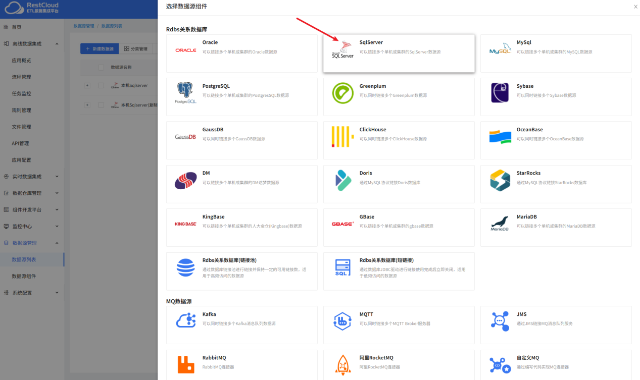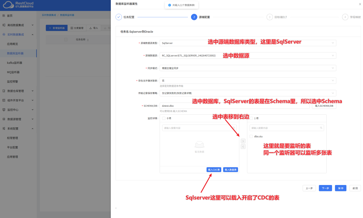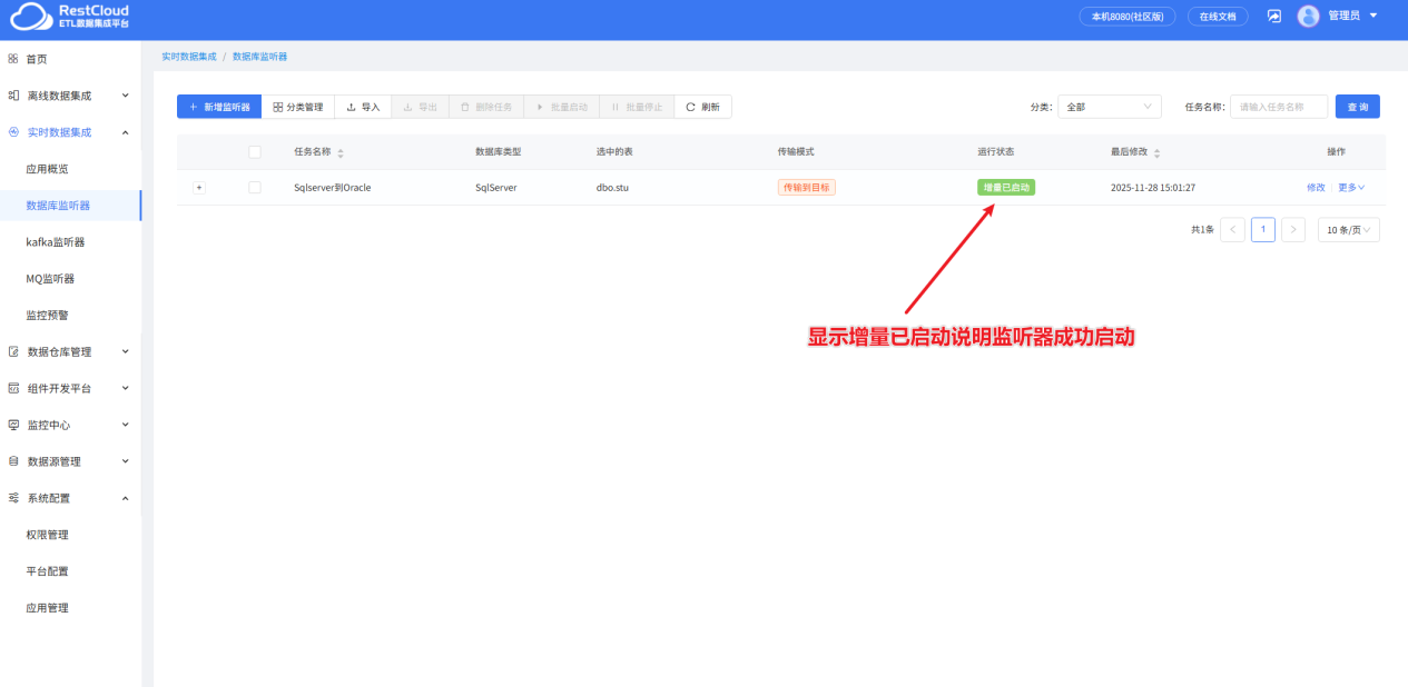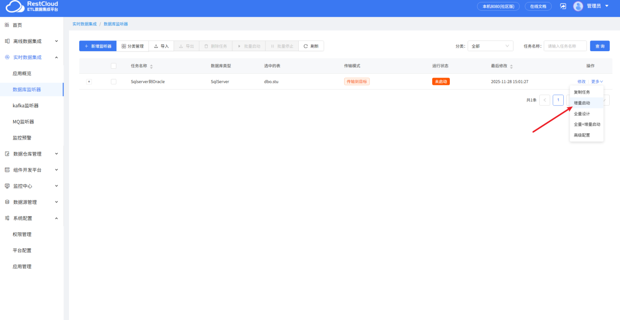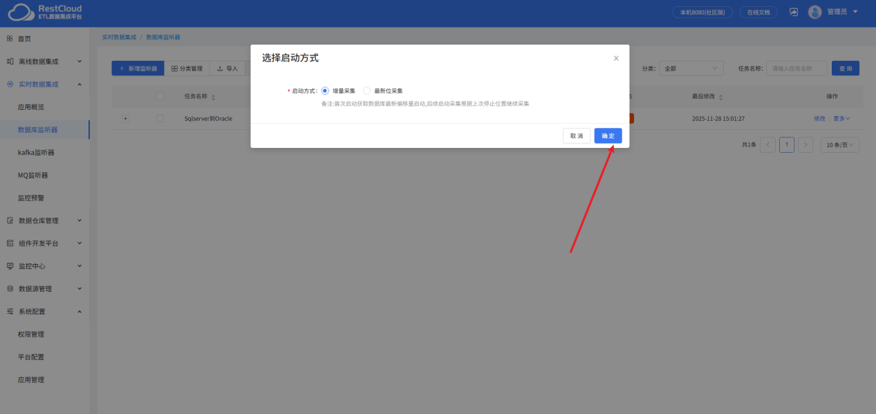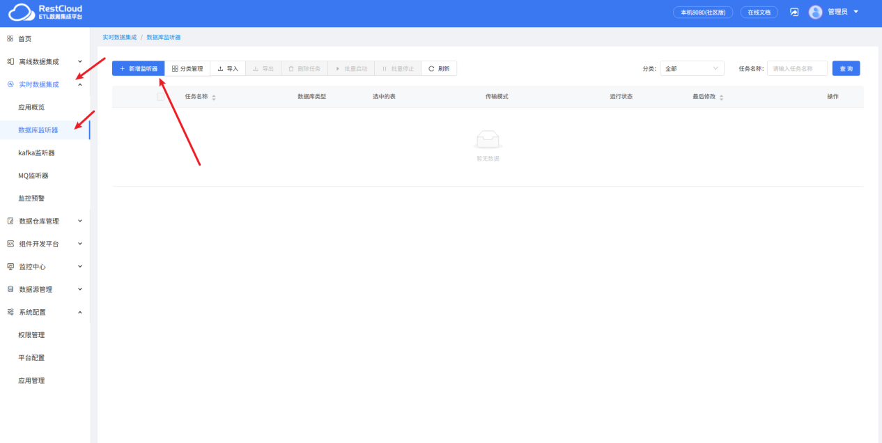 开启数据库的CDC后,来到实时数据集成模块创建数据库监听器。