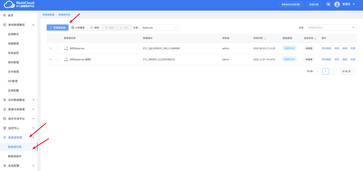 在平台首页左侧模块菜单栏找到数据源管理模块,下拉选择数据源列表选项。