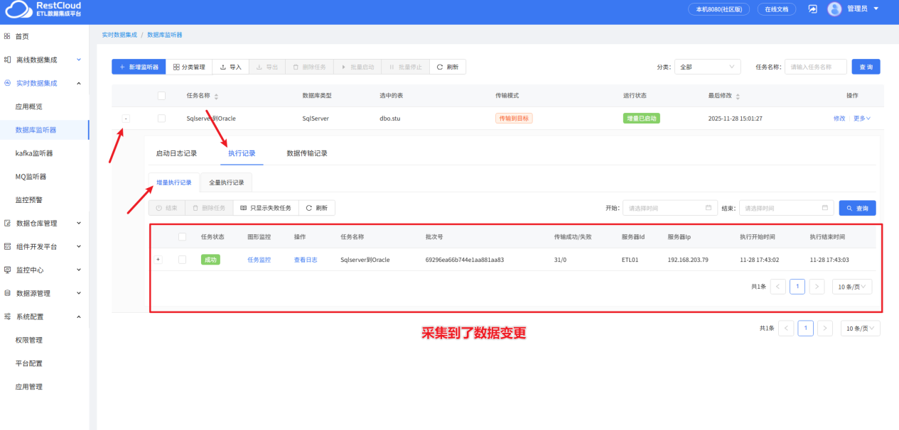 数据库监听器捕获到了源表的变更数据,并且直接将源端的增删改都同步到目标表。