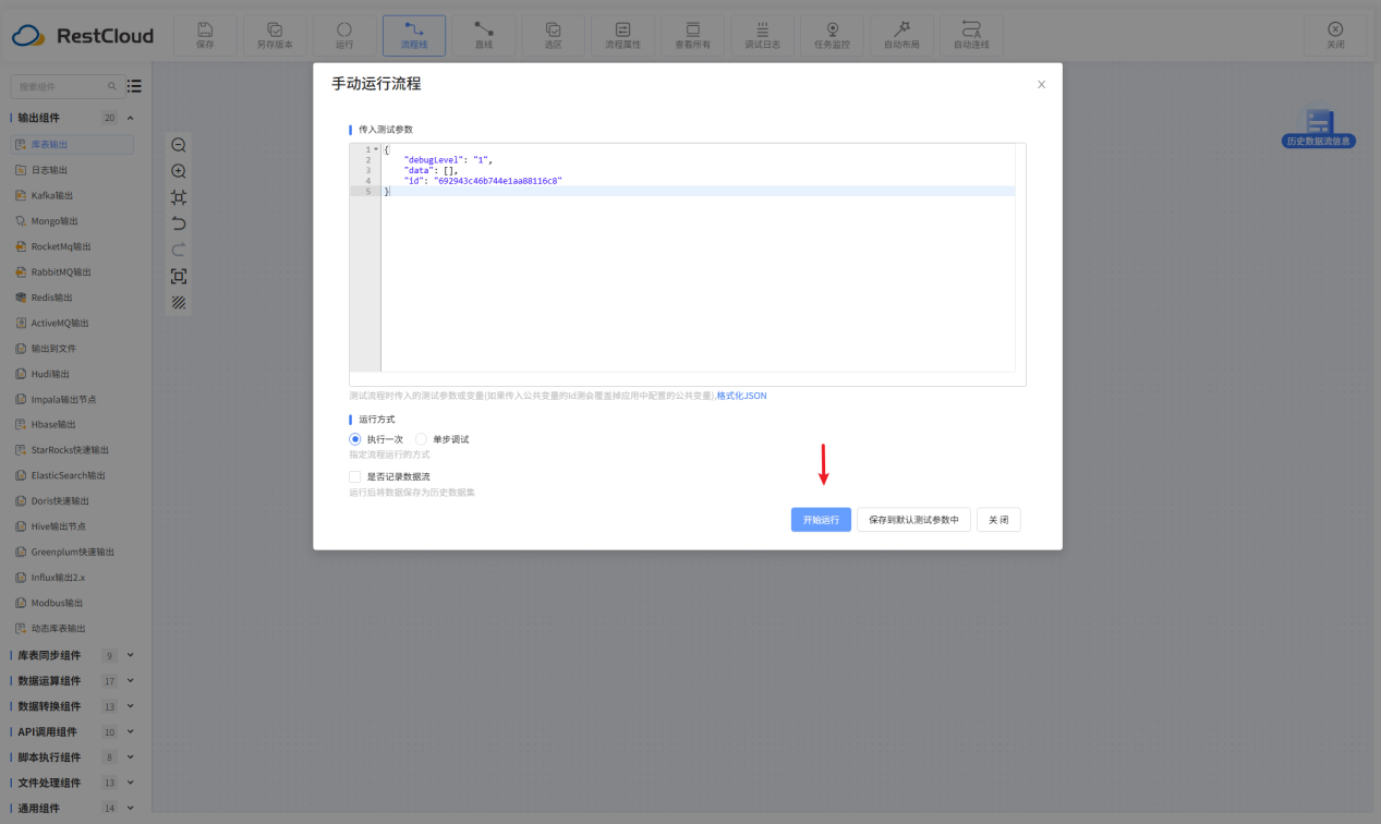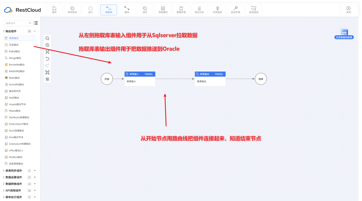 从左侧组件栏拖取组件到右侧画布,并用路由线从开始连接到最后。