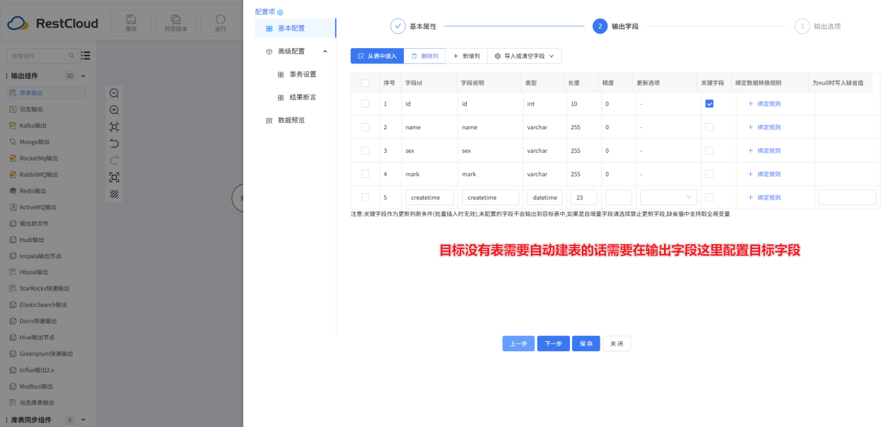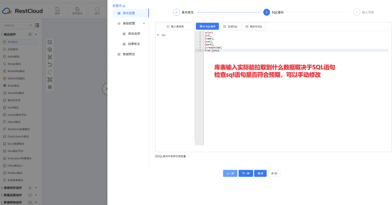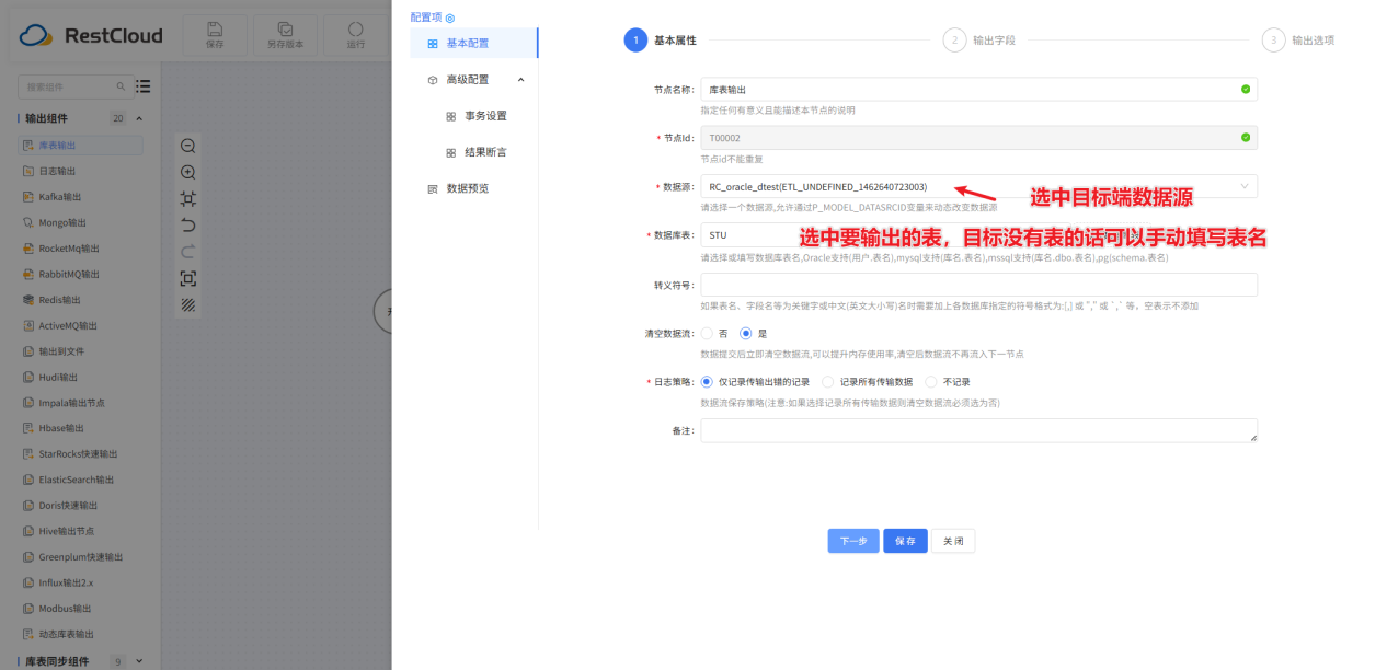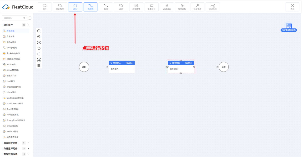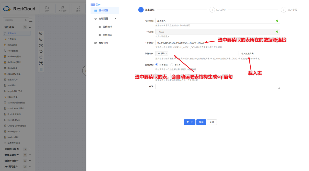 这里使用一个库表输入组件从SqlServer表拉取数据,用库表输出组件将数据推送到目标表。