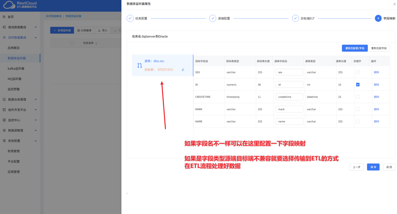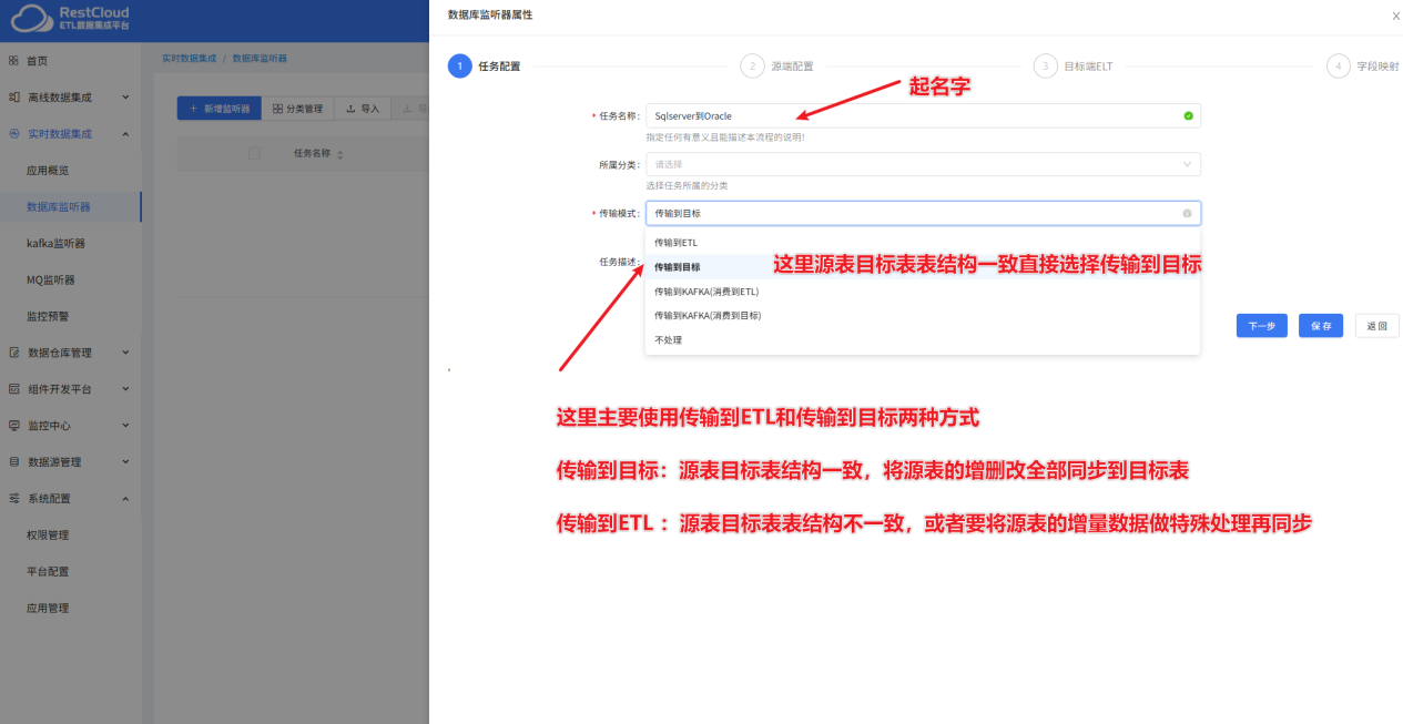 这里源表和目标表表机构一致就采用直接传到到目标的同步方式,如果需要对增量数据做特殊处理可以使用传输到ETL的方式。