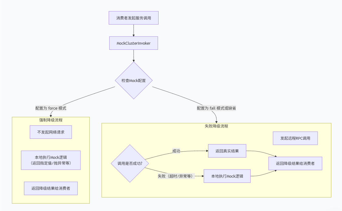 Dubbo的降级逻辑主要在 MockClusterInvoker 类中实现。其决策流程可以清晰地通过下图展示: