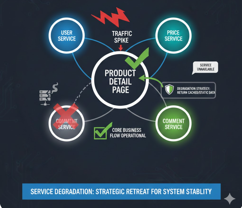 想象一下,在一个典型的微服务电商架构中,商品详情页 的渲染依赖于用户服务 、库存服务 、价格服务 和评论服务 。在大促流量洪峰时,如果相对非核心的评论服务因不堪重负而响应缓慢甚至宕机,是否应该让整个商品详情页加载失败?显然不是!