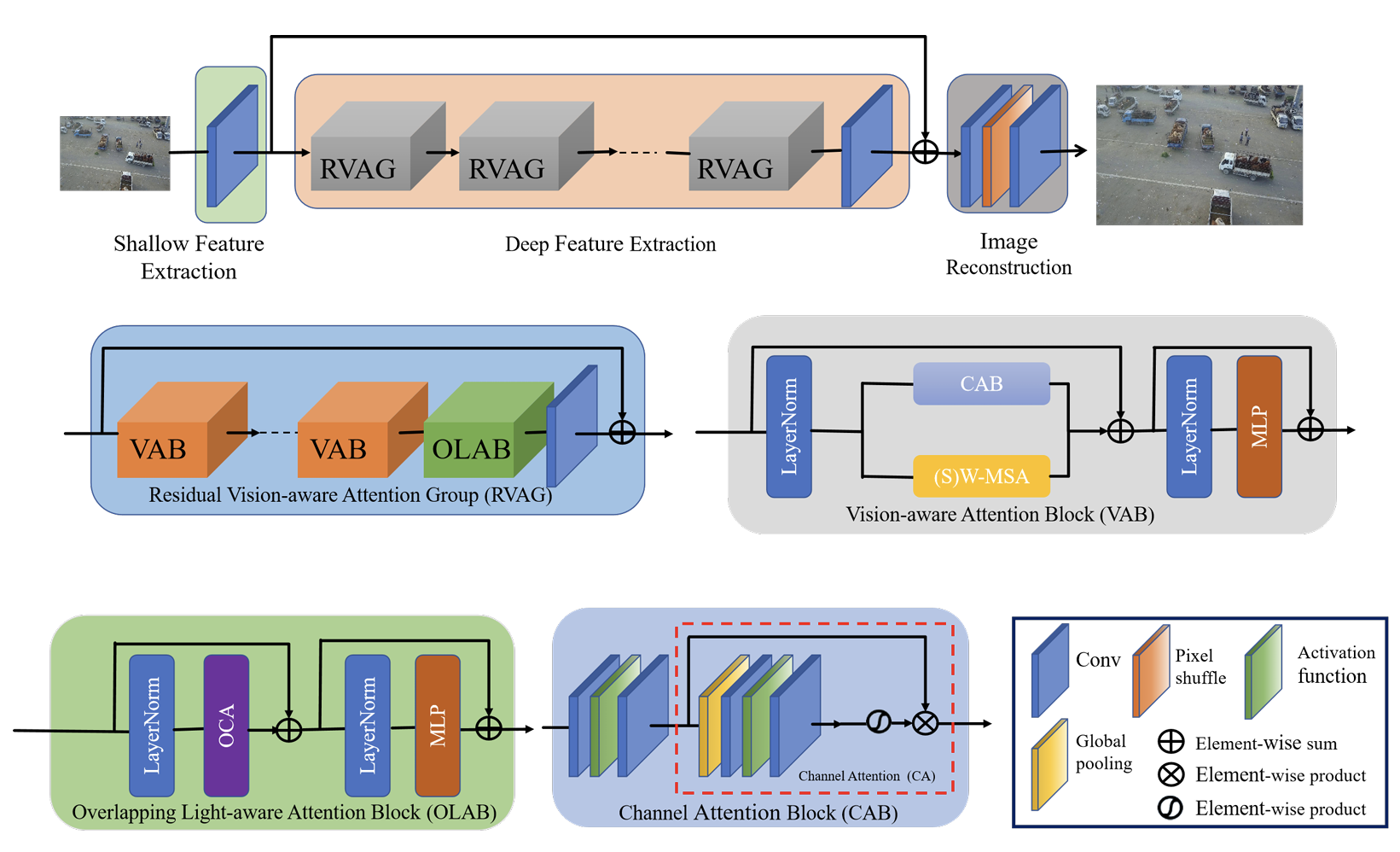 图3. 照明遮挡注意力模块。灰色模块代表残差视觉感知注意力组(RVAG),橙色模块代表视觉感知注意力块(VAB),绿色模块代表重叠光感知注意力块(OLAB)。