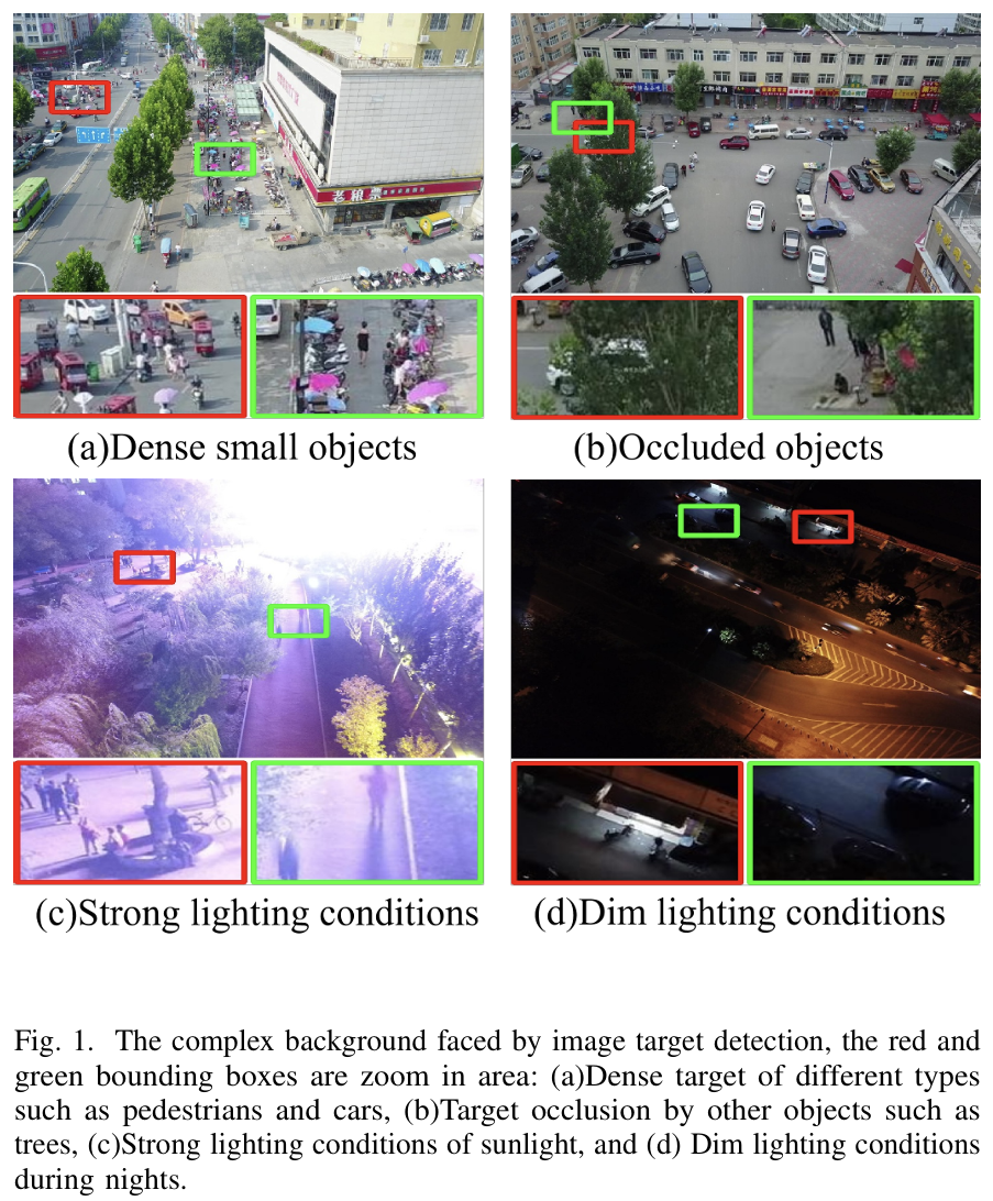 - 环境可变性:飞行位置、光照条件、天气和传感器噪声的变化导致图像中小目标的对比度和清晰度降低,进一步使检测工作复杂化。