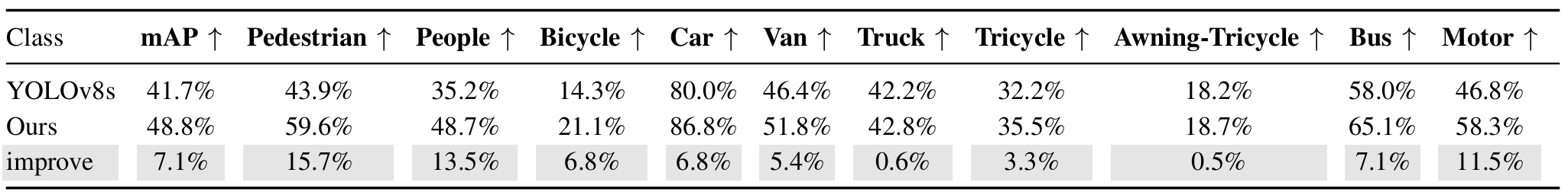 为了证明改进模型在增强检测性能方面的有效性,我们在改进模型和YOLOv8s之间进行了对比实验。如表IV的比较结果所示,展示了两个模型在各个类别上的AP值和所有类别的 m A P @ 0.5 mAP@0.5 mAP@0.5值。此外,改进模型的 m A P mAP mAP提高了7.1%。所有类别的AP值都有不同程度的提高,其中Pedestrian、People和Motor类别的增长超过10%。这些结果表明,改进模型有效地提高了检测精度。