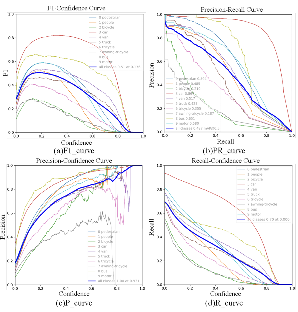 图7. 评估参数的可视化。(a)F1曲线。(b)PR曲线。©P曲线。(d)R曲线。