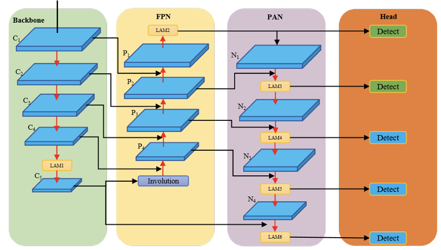 图2. LAM-YOLO结构。绿色部分是骨干,包含CSPDarkNet[40];黄色部分是FPN[39];紫色部分是PAN[41];橙色部分是Head;蓝色检测头是原始的YOLOv8,绿色检测头是我们引入的辅助检测头。