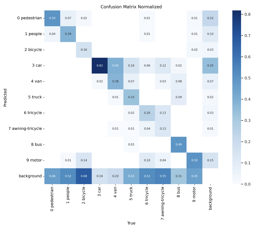 为了进一步评估我们模型的检测性能,我们进行了对比实验,重点关注三个关键方面:评估指标、混淆矩阵和模型推理结果。图7展示了改进模型在VisDrone2019数据集上的评估指标。图表从左到右、从上到下可视化了一致性平均值、精确率-召回率(P-R)曲线、准确率和召回率等关键指标。分析表明,LAM-YOLO在保持高召回率的同时实现了最佳检测精度。相应的混淆矩阵如图8所示。