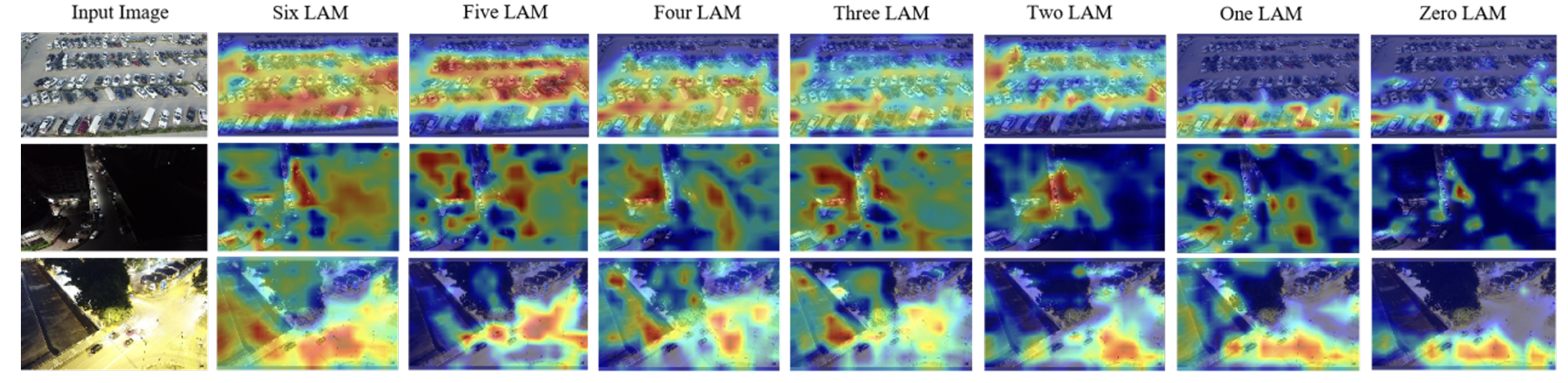 此外,图10通过Grad-CAM更直观地展示了不同数量LAM对输入图像特征提取的影响。随着LAM层数从"Six LAM"逐渐减少到"Zero LAM",热图中的突出区域变得较弱且分布不均匀,表明模型对重要特征的关注度正在下降。在各种场景中,随着LAM的减少,对目标的关注区域也缩小,对远处目标的关注逐渐减弱。
