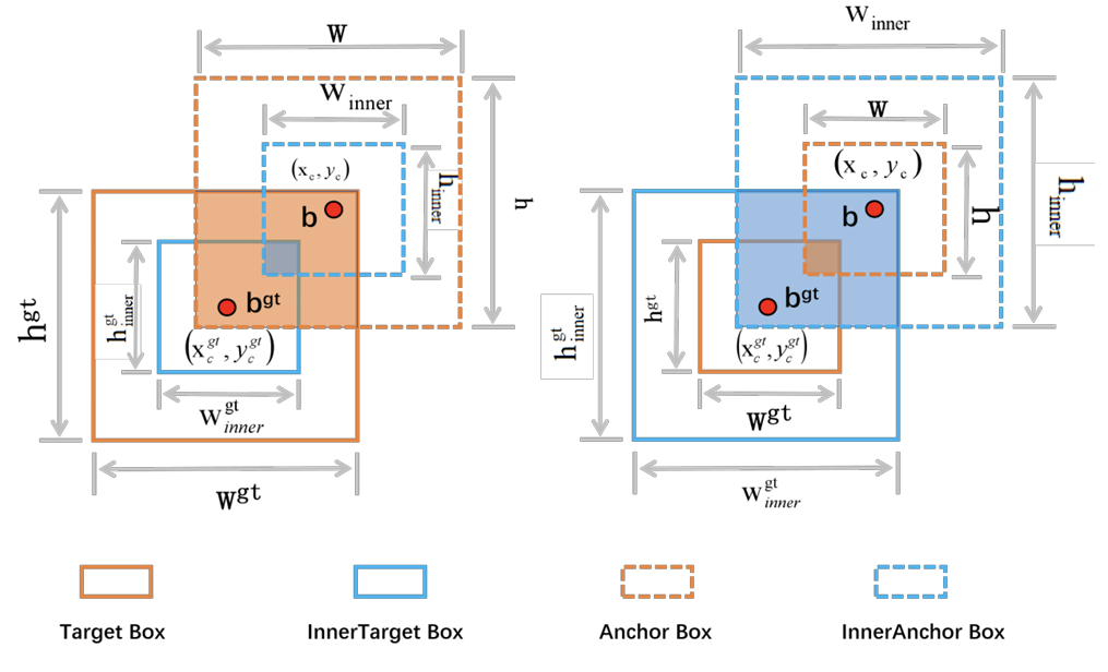 SIB-IoU引入了尺度因子控制来生成不同尺度的辅助边界框以计算损失,并将其应用于现有的IoU。如图5所示,GT框和锚框分别表示为 b g t b^{gt} bgt和 b b b,GT框的中心坐标记为 ( x c g t , y c g t ) (x_c^{gt}, y_c^{gt}) (xcgt,ycgt),锚框的中心坐标记为 ( x c , y c ) (x_c, y_c) (xc,yc)。GT框的宽度和高度分别用 w g t , h g t w^{gt}, h^{gt} wgt,hgt表示,而锚框的宽度和高度用 w , h w, h w,h表示。缩放因子,记为变量ratio,通常范围在 [ 0.5 , 1.5 ] [0.5, 1.5] [0.5,1.5]。当该比例小于1时,表示辅助边界框小于实际边界框,与IoU损失相比,有效回归范围更窄。然而,梯度的绝对值大于IoU损失产生的梯度,这有利于高IoU样本的更快收敛。相反,当比例超过1时,更大尺度的辅助边界框扩展了有效回归范围,并提高了低IoU样本的回归性能。相关公式如下: