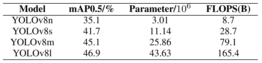 骨干网络的消融:YOLOv8在前身的基础上引入了新功能,增强了其对各种应用中广泛目标检测任务的适用性。官方发布了四个不同的YOLOv8模型:YOLOv8n、YOLOv8s、YOLOv8m和YOLOv8l,每个模型的大小和复杂程度不同。这些模型的参数详见表V。考虑到该模型旨在部署在无人机上,必须在准确性和复杂性之间取得仔细的平衡。在YOLOv8模型中,YOLOv8s在最小化复杂性的同时保持准确性方面提供了最佳的折衷方案。因此,我们的模型基于YOLOv8s架构开发。