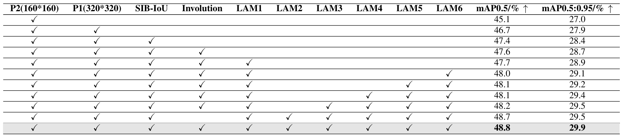 不同模型组件的消融:我们验证了每个提出的改进策略的有效性,并对模型进行了消融实验。结果如表III所示,每个改进策略都相应地提高了检测性能。第一个改进是增加了两个尺寸为160x160和320x320的检测头,这对于检测小目标特别有效,考虑到VisDrone2019数据集中小物体的普遍性,这是一个关键需求。P2检测头将精度提高了3.4%,P1检测头提高了1.6%。随后,照明遮挡注意力模块(LAM)混合注意力模块被逐步集成到每个输出层中,从而进一步提高了性能。Involution模块也有助于相对精度的提高,特别是在减少小目标的漏检率方面。总体而言,增强模型使平均检测精度提高了7.1%,在大多数检测指标上都有显著改进。