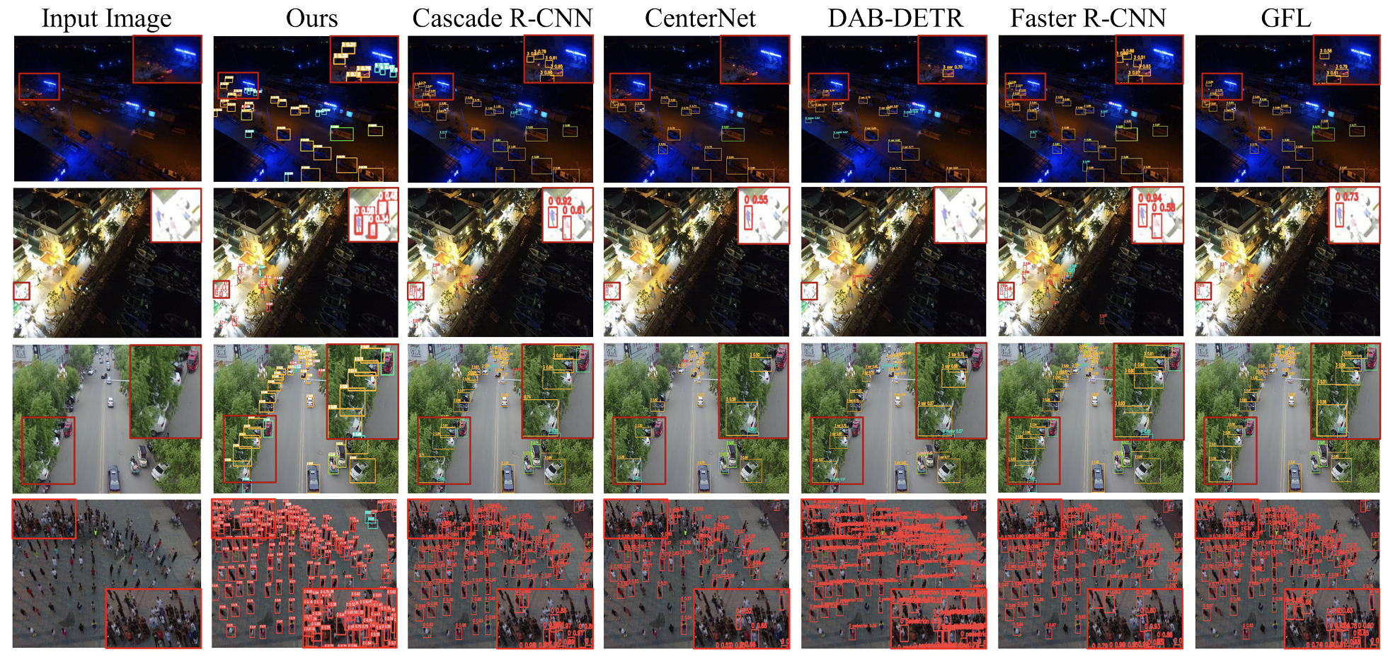图9. 模型在VisDrone2019数据集上的改进视觉检测结果。第一行代表不同方法在低光环境下的识别性能,第二行代表不同方法在强光环境下的识别性能,第三行代表不同方法在遮挡环境下的识别性能,第四行代表不同方法在密集环境下的识别性能。红色边界框表示局部放大区域。