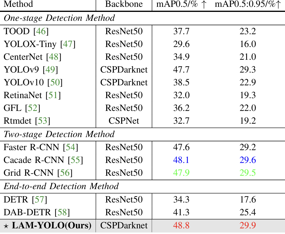 - Q1:与最先进技术的比较分析:我们将LAM-YOLO与其他前沿方法进行比较,重点放在第四节B中的定量评估和视觉结果上。