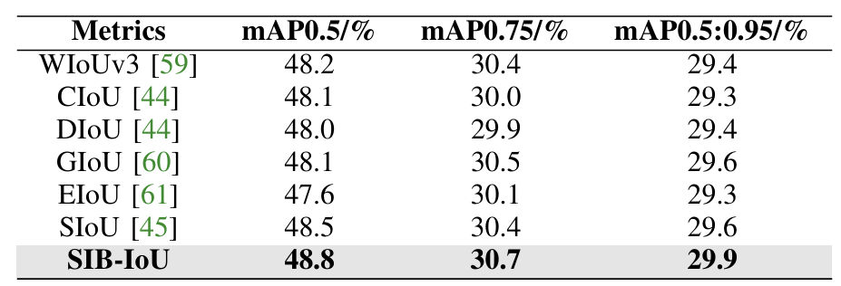 SIB-IoU损失函数的消融 :为了验证引入SIB-IoU的好处,我们在改进模型上使用SIB-IoU和其他主流损失函数进行了对比实验,同时保持一致的训练条件。结果如表VI所示。实验表明,当使用SIB-IoU作为边界框回归损失时,模型达到最佳检测性能。此外,使用SIB-IoU的模型的 m A P 50 mAP50 mAP50比使用CIoU的模型高0.7%,突出了SIB-IoU的有效性。