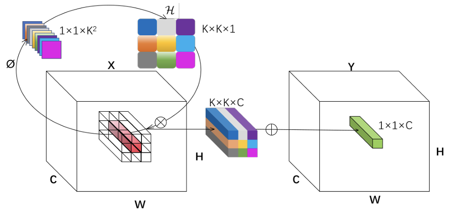 在图4中,为了便于演示(将 G G G设为1),X表示跨 C C C个通道的广播乘法, ∑ \sum ∑表示在 K × K K \times K K×K空间邻域内聚合的求和操作。因此,单个像素通道维度中包含的信息被隐式地分散在其空间附近,这对于获取丰富的感受野信息非常有用。
