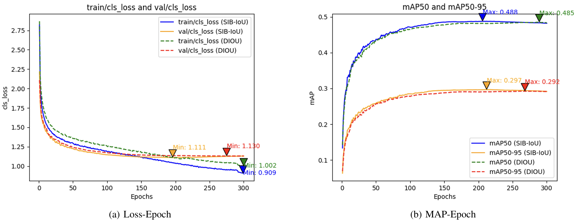 图11. (a)损失-周期和(b)mAP-周期上的检测方法的比较损失-指标曲线分析。我们的SIB-IoU损失表现出卓越的性能,其持续较高的训练速度证明了这一点,突显了其可以增强检测性能。