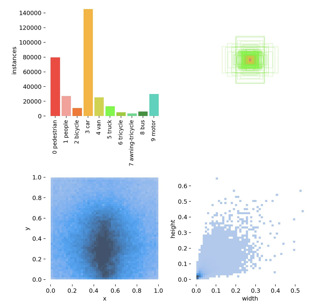 数据集 :我们使用VisDrone2019[8]公共数据集,这些数据集由各种专业无人机摄像头在14个不同场景(包括不同地点(城市和农村)和密度(稀疏和拥挤))下捕获。VisDrone2019数据集包含10种检测目标,如行人、车辆和自行车;然而,类别样本的分布高度不均匀。图6展示了类别分布的样本统计。在该图中,纵轴表示边界框的高度,横轴表示其宽度。观察表明,点集中在左下象限,表明小物体在VisDrone2019数据集中占主导地位。这一趋势反映了无人机技术的实际应用,并与本文的研究背景和解决的问题非常吻合。