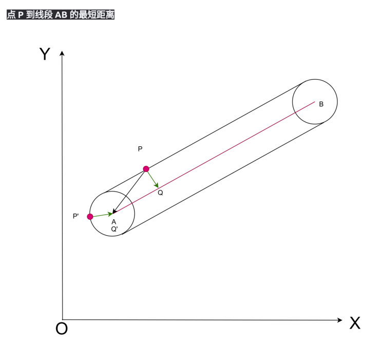 那么数学化一点的描述就是:求采样点P到到线段AB的最短距离,距离小于r时着色。