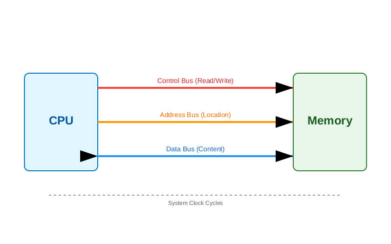 - 控制总线 (Control Bus):CPU 发出读(Read)或写(Write)信号,以及其他控制信号(如总线锁定、中断应答等)。
