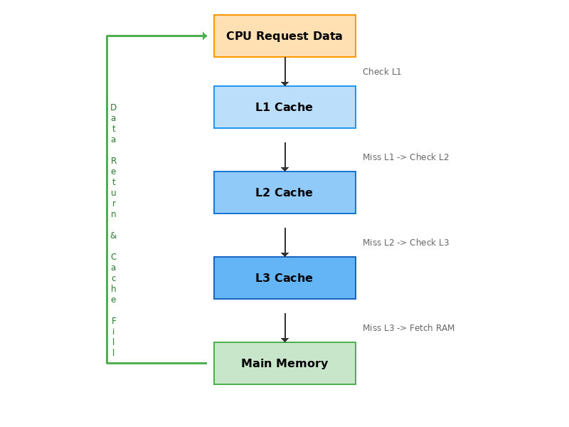 - Miss (未命中):逐级向下查找,直到访问主存。主存访问不仅延迟高,还会阻塞 CPU 流水线。