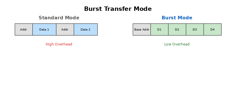 内存不仅支持单次读写,还支持突发传输。当 CPU 发出一个基地址后,内存可以连续传输相邻的多个数据单元,而无需每次都发送地址。