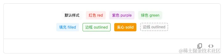第一行展示了不同颜色的标签效果,通过 color 属性可以快速设置标签的主题色。第二行展示了四种变体样式:填充、边框、实心、虚线。每种样式都有其独特的视觉特征,适用于不同的使用场景。