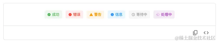 TolyUI 的 TolyTag 组件支持自定义图标,配合合适的颜色,可以创建出语义明确的状态标签。示例包含六种常见状态:成功、错误、警告、信息、等待中、处理中。每个状态都采用了符合直觉的颜色和图标搭配,特别是处理中状态使用了动态的加载指示器,提供更生动的视觉反馈。