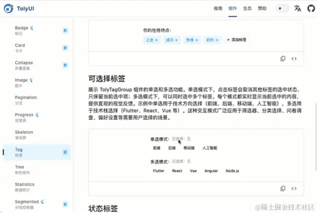 对于筛选和分类场景,标签需要支持选择功能。TolyUI 提供了 TolyTagGroup 组件,支持单选和多选两种模式。