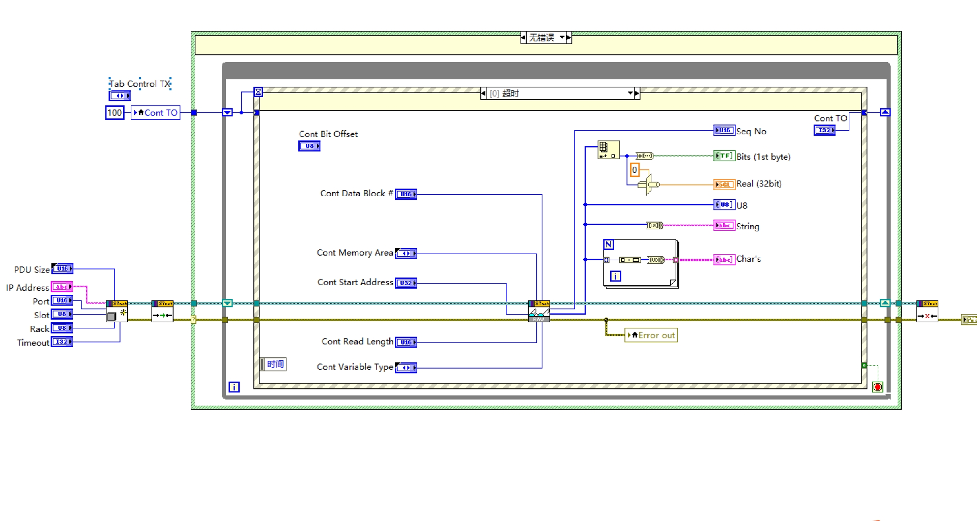 LabVIEW里直接通过TCP Write发送这段十六进制字节,就能触发PLC响应。重点在于地址换算------西门子的内存地址都是按位偏移算的,比如DB100.DBX0.0对应地址0x00000000,而DB100.DBW0对应0x00000008(每个字节占8位)。