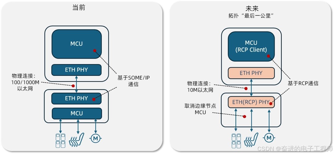 RCP(Remote Control Protocol)作为一种轻量级通信协议,其核心思想是将边缘节点控制器中MCU的协议转换功能迁移至区域控制器(ZCU)或中央计算单元(CCU),从而实现边缘节点的远程控制、实现网络中软件集中化与硬件轻量化。近年来,该技术日益受到行业关注,预计将显著改变车辆网络拓扑结构。