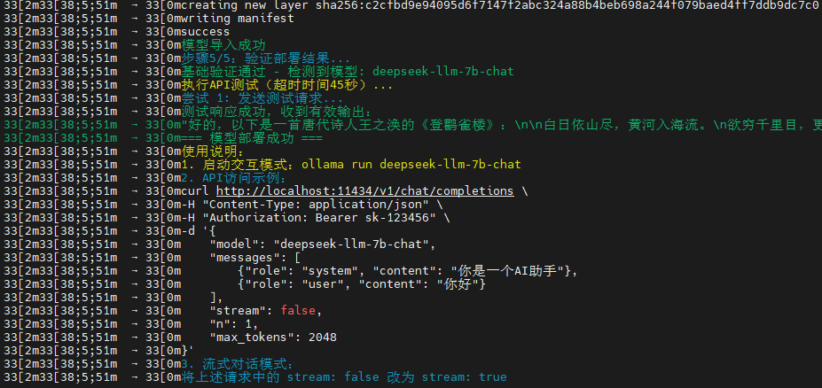 DeepSeek-LLM-7B-Chat 模型的部署成功日志,显示了模型已成功导入并通过验证测试。系统提供了三种使用方式: