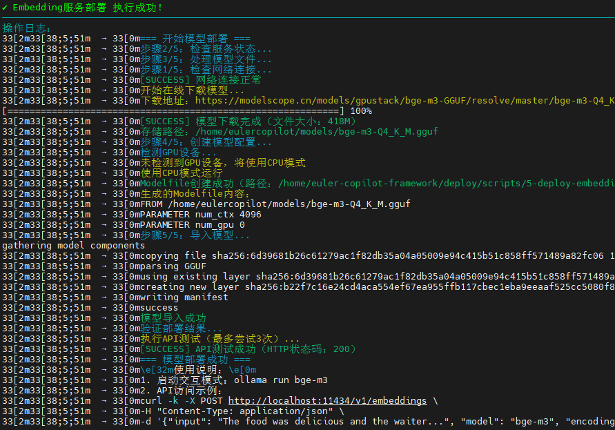 成功部署了 bge-m3 文本嵌入模型(GGUF格式,418MB),从 ModelScope 下载模型文件到本地路径,配置为 CPU 模式运行(未检测到 GPU),设置了上下文长度 4096,并通过 API 测试验证部署成功(HTTP 200),最终可通过 ollama run bge-m3