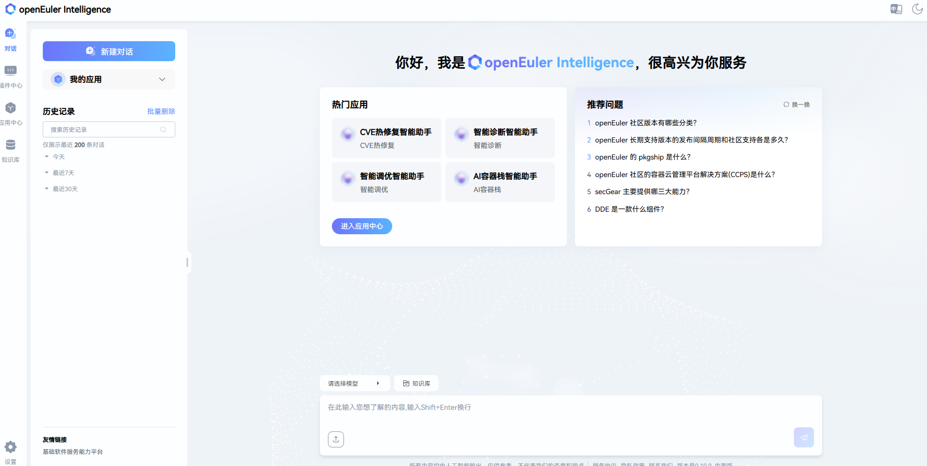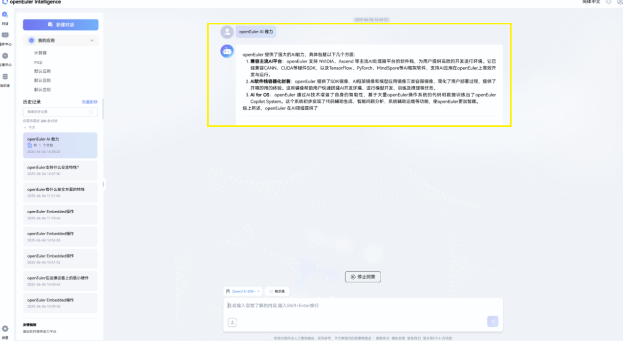 通过以上完整部署流程,我们成功在华为云 openEuler 22.03 LTS 系统上部署了 openEuler Intelligence 智能化平台。该平台提供了强大的知识管理和智能问答能力,特别适合企业级知识库建设和智能化客服场景。平台的主要优势包括: