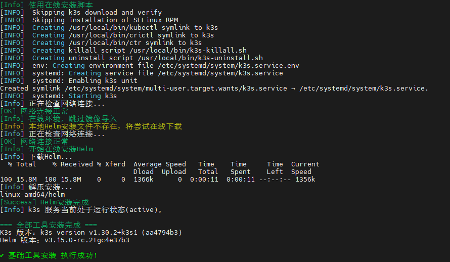 部署脚本通过在线方式,自动完成了容器编排工具K3s(v1.30.2)和软件包管理工具Helm(v3.15.0)的下载与安装,并确认了K3s服务已成功启动并运行。整个过程顺利无误,标志着部署所需的核心底层基础设施已准备就绪,为后续部署更上层的应用服务(如数据库、大模型等)奠定了可靠的基础。
