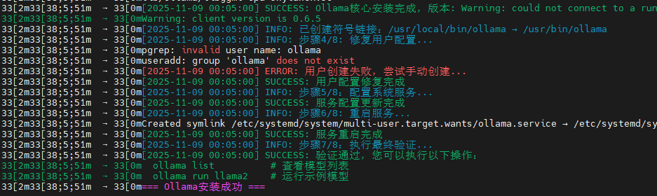 该步骤记录了Ollama人工智能模型平台(版本0.6.5)在部署过程中成功完成系统集成的关键步骤。尽管在创建专用用户和用户组时遇到了"invalid user name: ollama"和"group 'ollama' does not exist"的配置错误,但部署脚本通过自动检测并执行手动创建成功修复了用户配置。整个过程系统完成了核心文件安装、创建符号链接、更新系统服务配置并重启服务,最终通过全部验证。