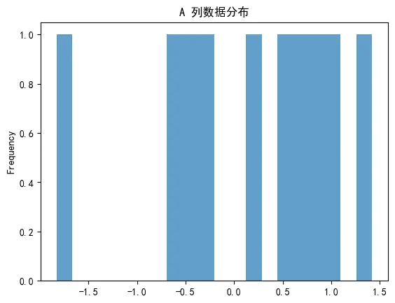 df['A'].plot(kind='hist', bins=20, alpha=0.7, title='A 列数据分布')