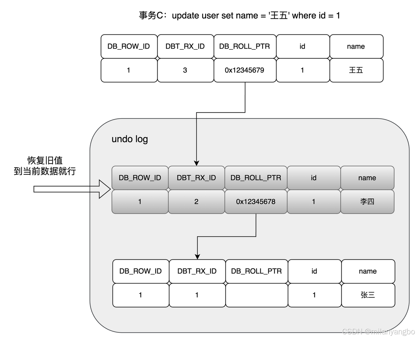 现在想回滚到事务B,name值为"李四"的时候,只需通过回滚日志的链表指针顺着列表找到对应的回滚日志日志,将旧值恢复到数据行即可。